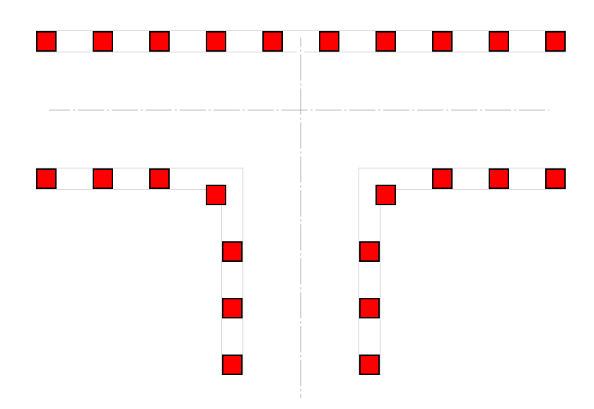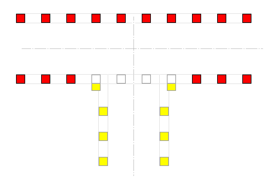 Von der Mitte der Seitengasse aus gesehen stehen die Pylonen somit im Abstand von 1,05 m. Die beiden im Winkel zur Hauptgasse werden so zur Seite geschoben (ca. 0,22 m), dass zur Mittellinie der Hauptgasse auch ein Abstand von 1,05 entsteht.