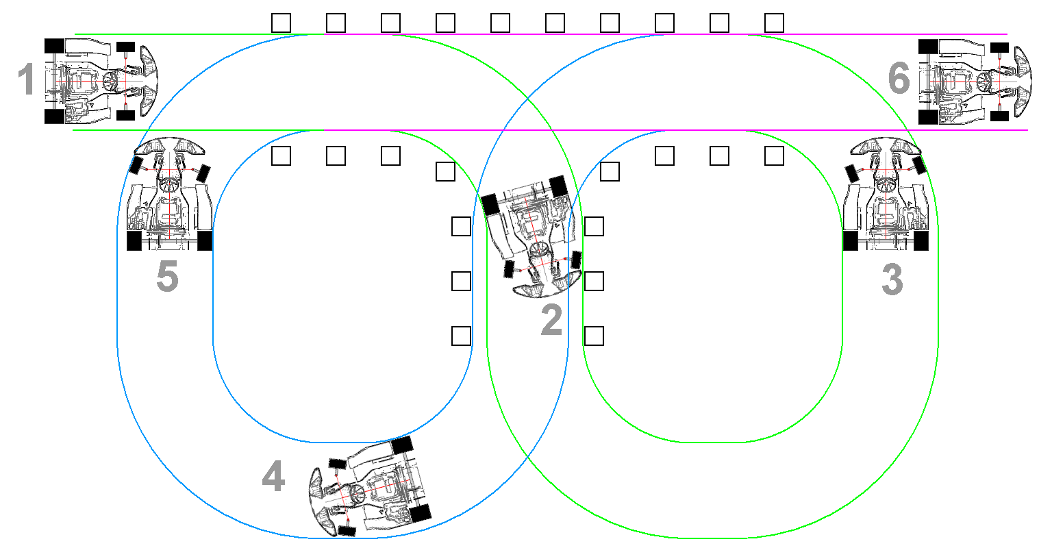 Der Aufbau der Brezel beginnt mit einer geraden Spurgasse. Diese besteht aus jeweils 10 Pylonen. Auf der Innenseite können die beiden mittleren entfallen. So verbleibt eine Lücke von 2,10 m.