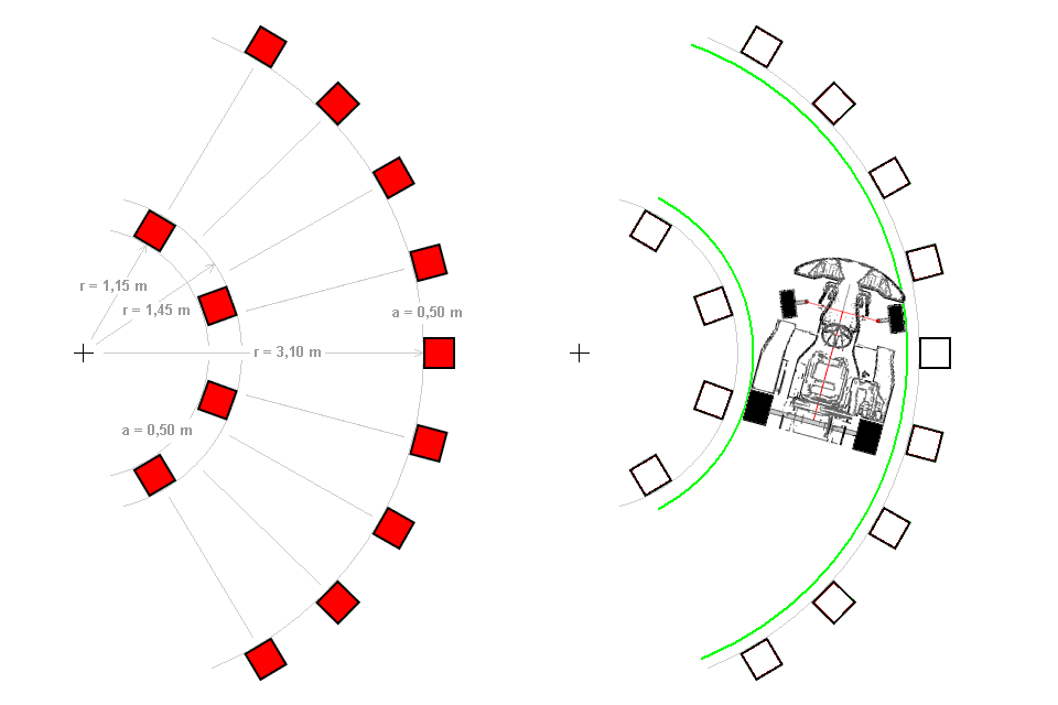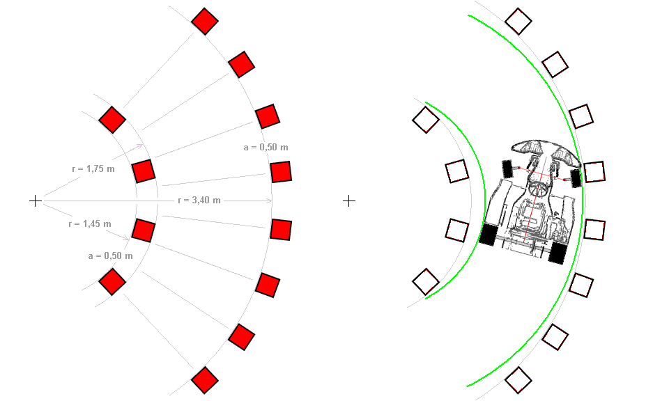 Die Pylonen werden im Abstand von 0,5 m aufgestellt. Dies entspricht auf dem Innenkreis einem Winkel von 23,5° und auf dem Außenkreis von 11,75°.