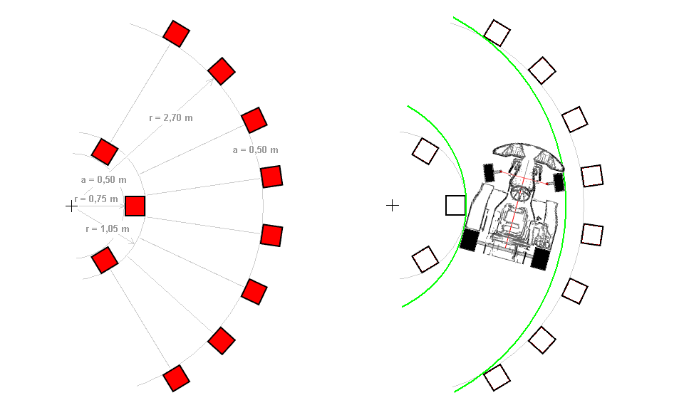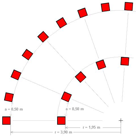 Die Pylonen werden im Abstand von 0,5 m aufgestellt. Dies entspricht auf dem Innenkreis einem Winkel von 23,5° und auf dem Außenkreis von 11,75°.
