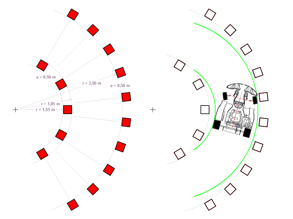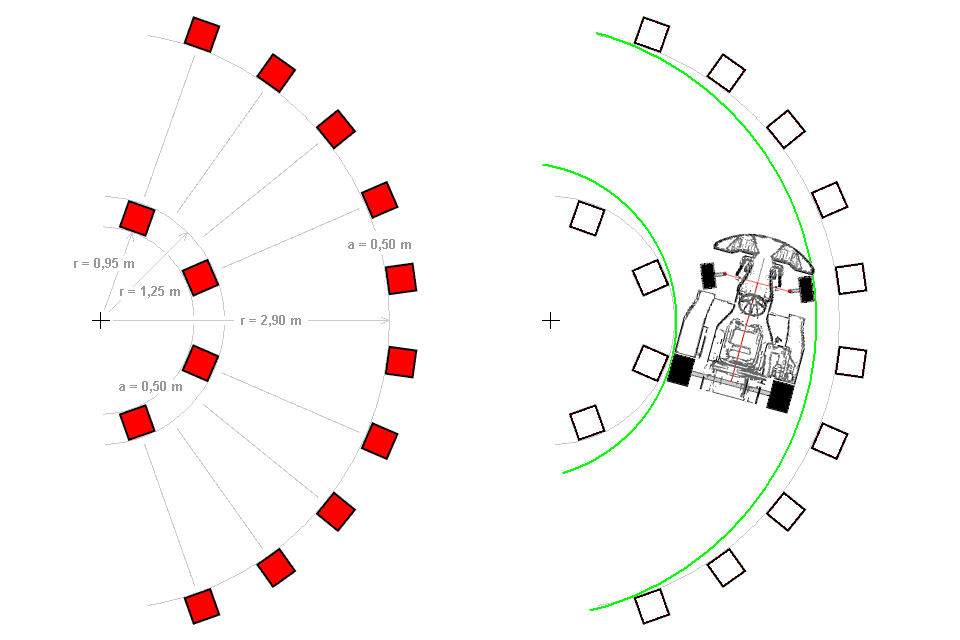 Eine gebogenen Spurgasse ist besonders einfach aufzubauen, wenn bestimmte Festlegungen getroffen werden. Ideal ist, wenn in einem Winkelbereich auf der Außenlinie doppelt so viele Pylonen stehen wie auf der Innenseite. Durch die vorgegebene Fahrspurbreite von 1,65 m zuzüglich 0,30 m für eine Pylone steht die Differenz beider Radien mit 1,95 m fest. Somit muss auch der innere Radius 1,95 m besitzen, damit außen ein doppelt so großer von 3,90 m entsteht.