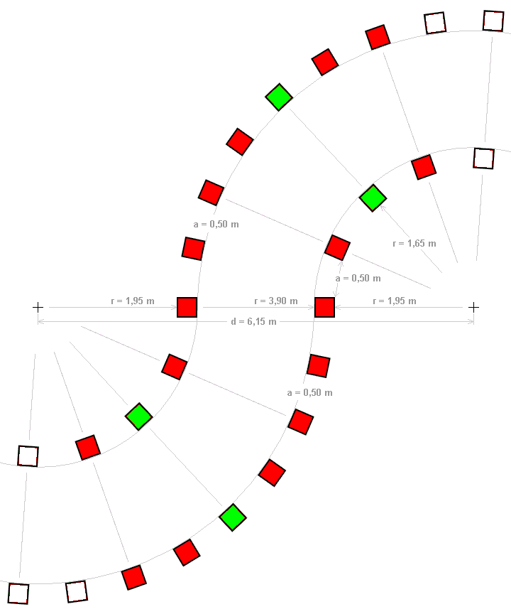 Eine S-Gasse ist besonders einfach aufzubauen, wenn bestimmte Festlegungen getroffen werden. Ideal ist, wenn in einem Winkelbereich auf der Außenlinie doppelt so viele Pylonen stehen wie auf der Innenseite. Durch die vorgegebene Fahrspurbreite von 1,65 m zuzüglich 0,30 m für eine Pylone steht die Differenz beider Radien mit 1,95 m fest. Somit muss auch der innere Radius 1,95 m besitzen, damit außen ein doppelt so großer von 3,90 m entsteht.