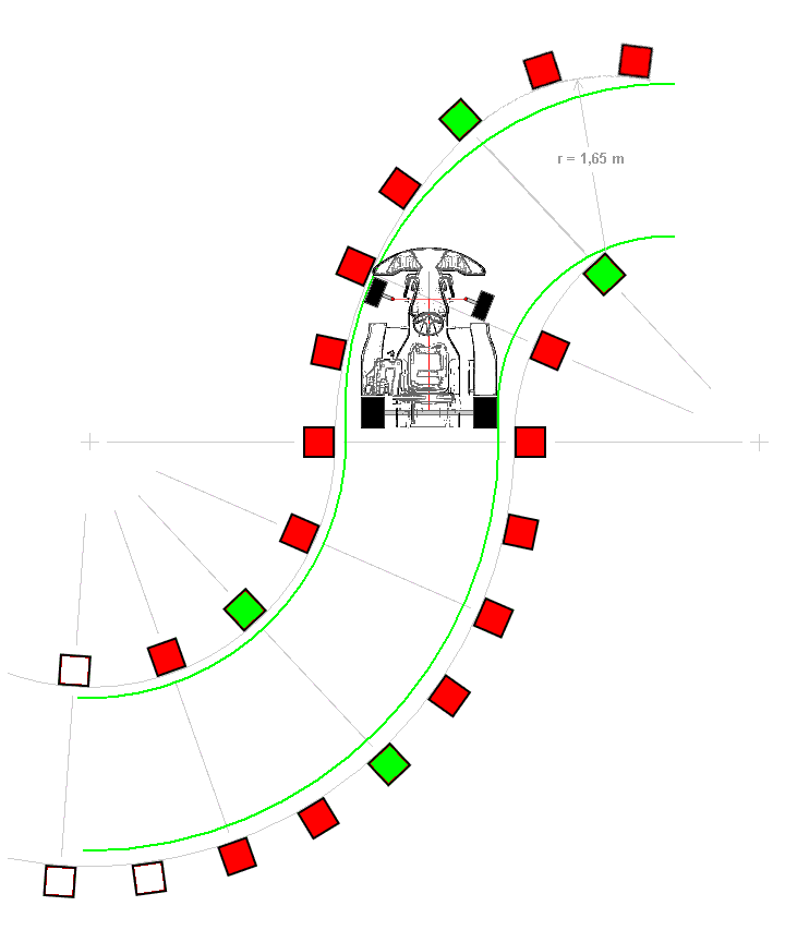 Außerdem ist es möglich, die Ein- oder Ausfahrt mit einem anderen (engeren) Radius zu gestalten, um den Schwierigkeitsgrad zu erhöhen. Hierfür wird einfach an der Ecke der letzten Innenpylone ein Radius von 1,65 m (Fahrspurbreite) gezeichnet und zwei Pylonen im einem Zwischenraum von je 0,5 m aufgestellt.